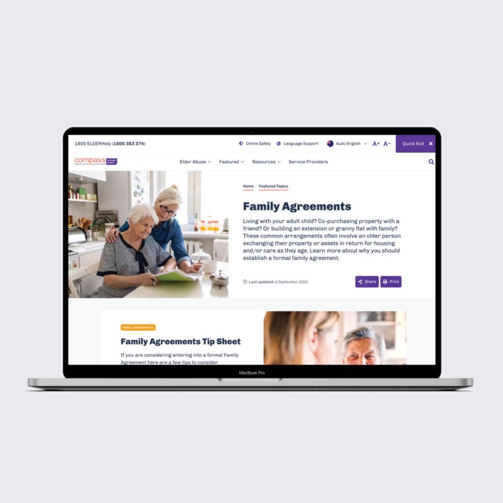 Compass is an online hub for resources on navigating elder abuse in Australia. It aims to jump-start the national conversation about elder abuse and streamline the process of connecting people to information and support services.